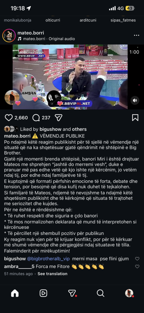 Familjarët e Mateos kanë reaguar publikisht pas një situate të tensionuar që ndodhi brenda shtëpisë së Big Brother, ku banori Miri iu drejtua atij me një shprehje kërcënuese.