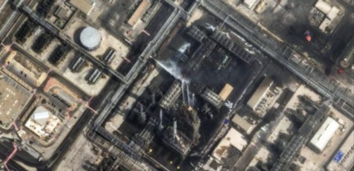 Pamjet tregojnë zona të djegura dhe gjurmë zjarri pranë kullave të ftohjes në pjesën qendrore të objektit, që ndodhet në qytetin lindor Ras Tanura.