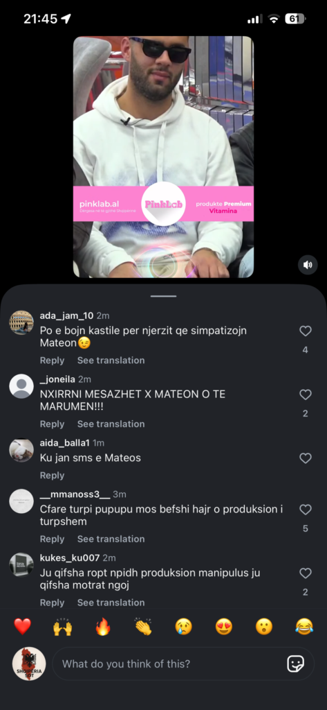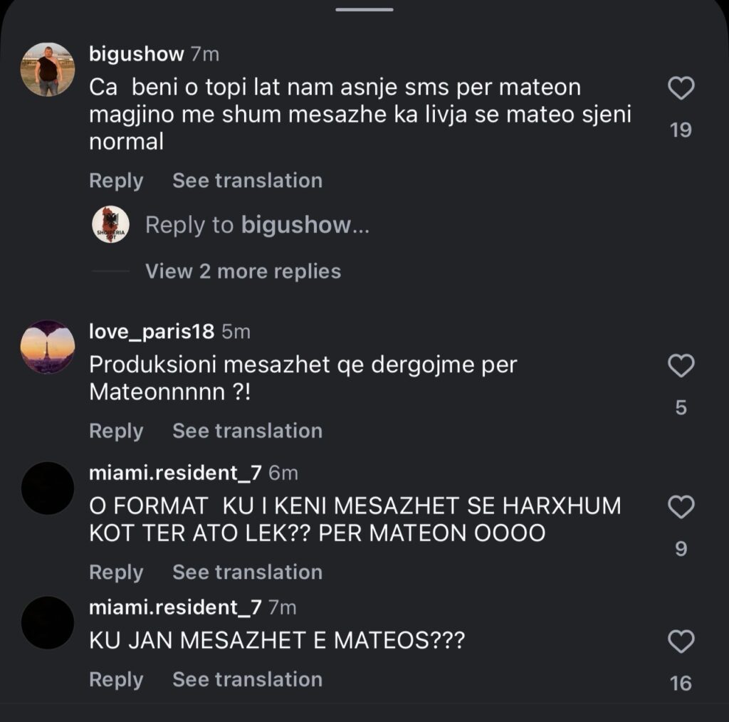 Sipas komentuesve, produksioni ka lexuar kryesisht mesazhe që përfshinin çiftin Mateo–Brikena, ndërsa nuk është dhënë pothuajse asnjë mesazh individual për Mateon. Kjo ka sjellë një “stuhi” komentesh negative, ku ndjekësit akuzojnë produksionin për anashkalim dhe mungesë transparence.