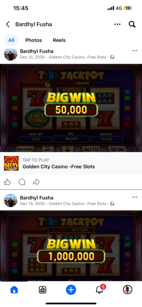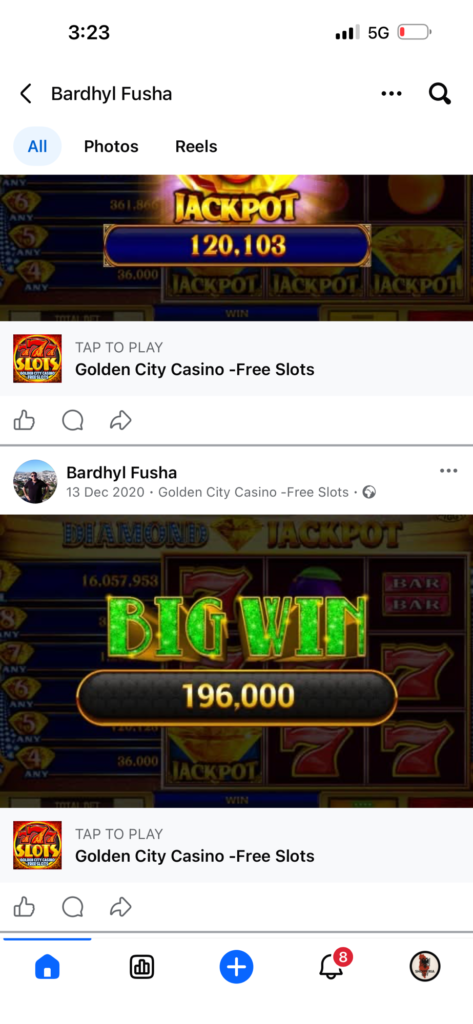 Në disa publikime të vitit 2020, ai shfaqet duke shpërndarë rezultate nga aplikacione të lojërave virtuale të fatit, konkretisht “Golden City Casino – Free Slots”. Në pamjet e postuara duken fitore virtuale me shuma të konsiderueshme si “Big Win 50,000” dhe “Big Win 1,000,000”.