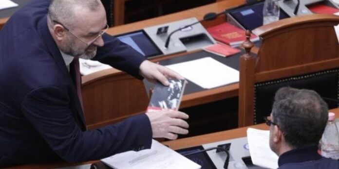 Ulsi Manja i ka dhuruar Erion Braçes këtë të enjte në sallën e Kuvendit një libër.