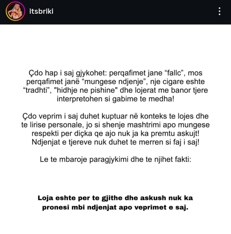 “Çdo veprim i saj duhet kuptuar në kontekst të lojës dhe të lirisë personale, jo si shenjë mashtrimi apo mungesë respekti për diçka që ajo nuk ia ka premtuar askujt! Ndjenjat e të tjerëve nuk duhet të merren si faj i saj!” – vijon shkrimi.
