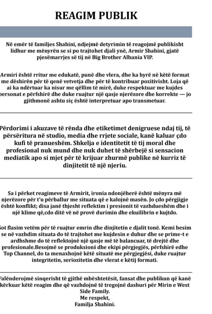 Në fund, familja falënderon mbështetësit dhe publikun për përkrahjen, duke nënshkruar reagimin si “Familja Shahini”.