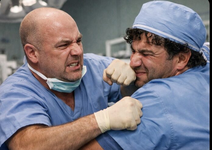 Ndërsa më pas është dashur ndërhyrja e një personi tjetër nga personeli mjekësor, për të ndarë dy kirurgët.