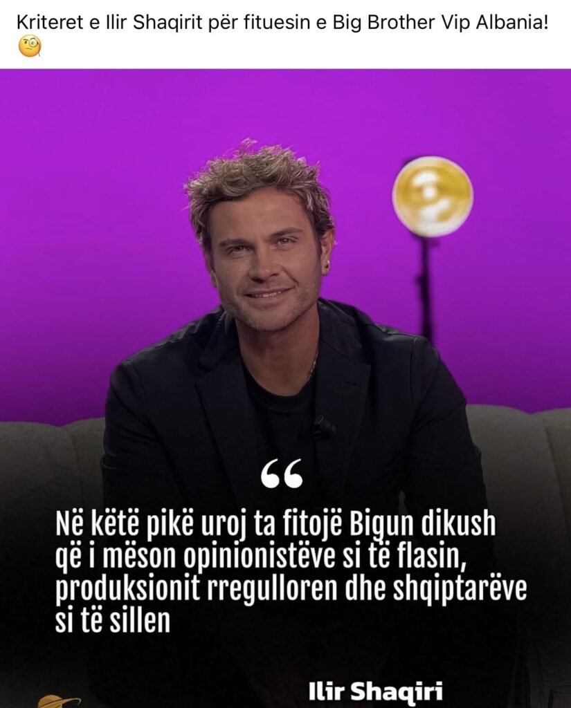 Fituesi i një edicioni të mëparshëm të Big Brother VIP, Ilir Shaqiri, ka bërë një koment ironik lidhur me situatën. Ai u shpreh se shpreson që fituesi i këtij sezoni të jetë dikush që di si të komunikojë dhe të sillet siç duhet me opinionistët, produksionin dhe publikun shqiptar.