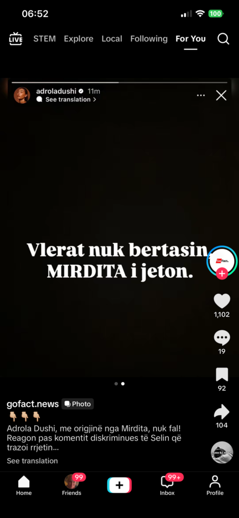 Një nga reagimet më të forta ka ardhur nga AdrolA Dushi , e cila – duke qenë me origjinë nga Mirdita – ka reaguar publikisht duke mbrojtur vendin dhe vlerat e tij. Postimi i saj është shpërndarë masivisht dhe ka marrë mbështetje të madhe nga ndjekësit.