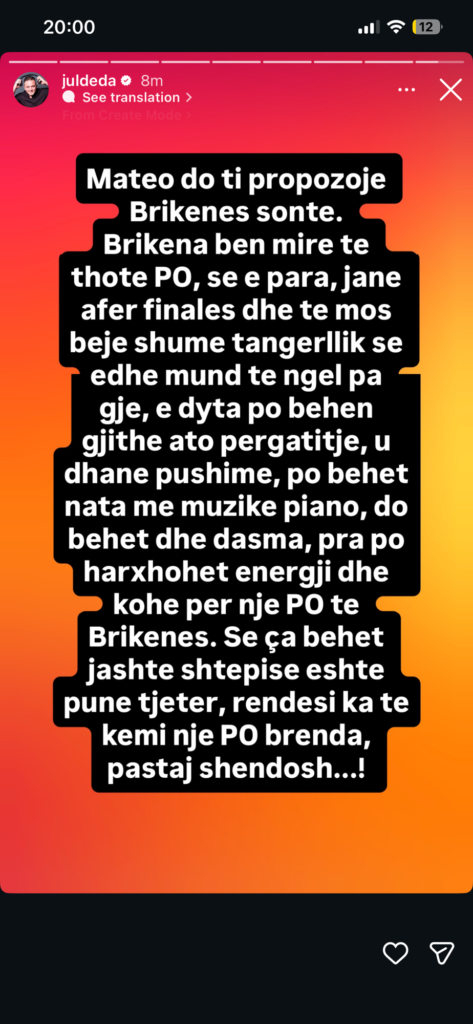 Një deklaratë që po bën xhiron e rrjetit ka ardhur nga Jul Deda, i cili ka zbuluar se sonte në Big Brother VIP pritet një nga momentet më të forta të këtij edicioni: propozimi për martesë i Mateos ndaj Brikenës.
