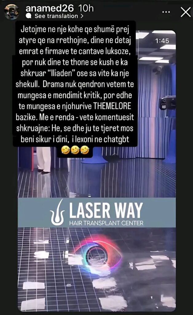 Më tej, ajo ka komentuar mbi realitetin e shoqërisë bashkëkohore: “Jetojmë në një kohë që shumë prej atyre që na rrethojnë dinë në detaj emrat e firmave të çantave luksoze, por nuk dinë të thonë se kush e ka shkruar ‘Iliadën’ ose sa vite ka një shekull. Drama nuk qëndron vetëm te mungesa e mendimit kritik, por edhe te mungesa e njohurive THEMELORE bazike.” Ky koment nxjerr në pah një shqetësim më të gjerë social mbi arsimimin dhe nivelin e dijes bazike, i cili duket se shpesh injorohet ose relativizohet.