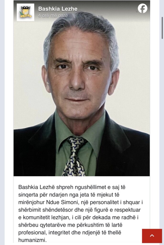 Bashkia e Lezhës ka ndarë lajmin e trishtë, ku mjeku i njohur Ndue Simoni është ndarë nga jeta ditën e sotme.
