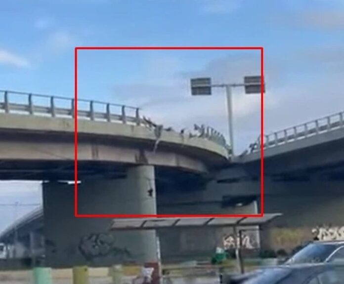 Si pasojë, automjeti është përplasur me barrierat anësore të urës, duke i shkatërruar plotësisht dhe duke i “marrë përpara”. Pas goditjes së fortë, makina ka “fluturuar” rreth 300 metra, përpara se të përfundonte mbi një dyqan lodrash poshtë mbikalimit.