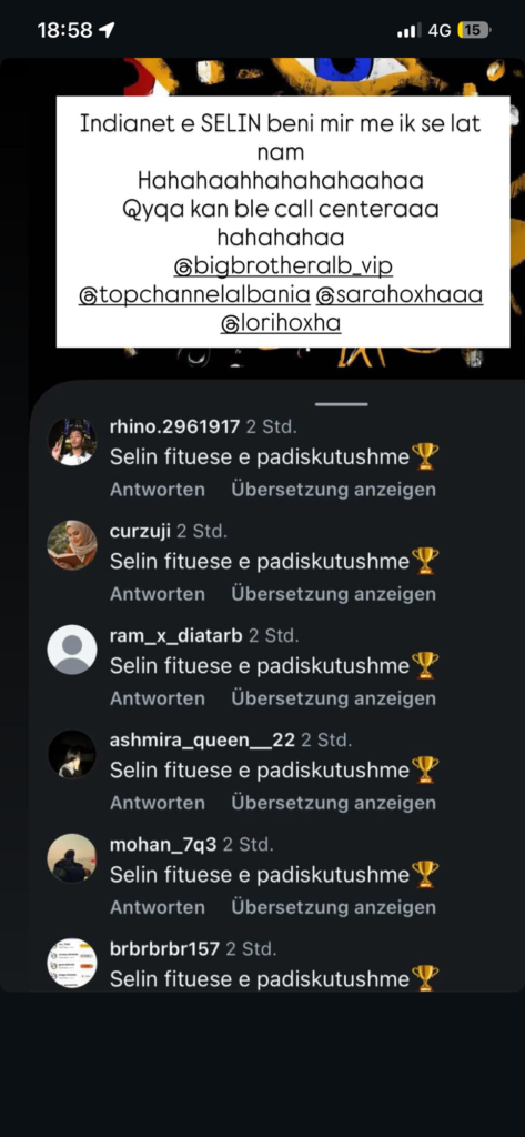 Në një foto që po qarkullon online, shihen dhjetëra komente pothuajse identike me tekstin: “Selin fituese e padiskutueshme”, të postuara nga profile të ndryshme, duke krijuar përshtypjen e një mbështetjeje masive.