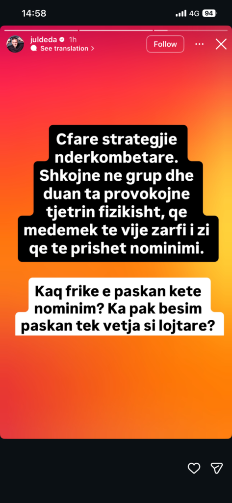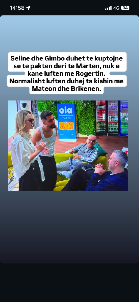Përmes një postimi në Instagram Story, ai ka komentuar drejtpërdrejt strategjinë e disa banorëve, duke lënë të kuptohet se sipas tij Selina dhe Gimbo po tentojnë të provokojnë Rogerin që situata të dalë jashtë kontrollit.