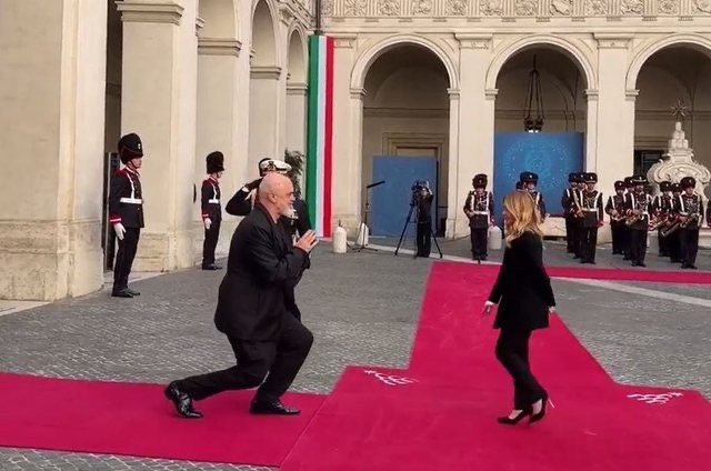 Gjatë momentit të pritjes, Rama tërhoqi vëmendjen edhe një herë me gjestin e tij të veçantë, duke u ulur në gjunjë para Melonit, një veprim që ka ngjallur reagime dhe komente të shumta në opinionin publik.