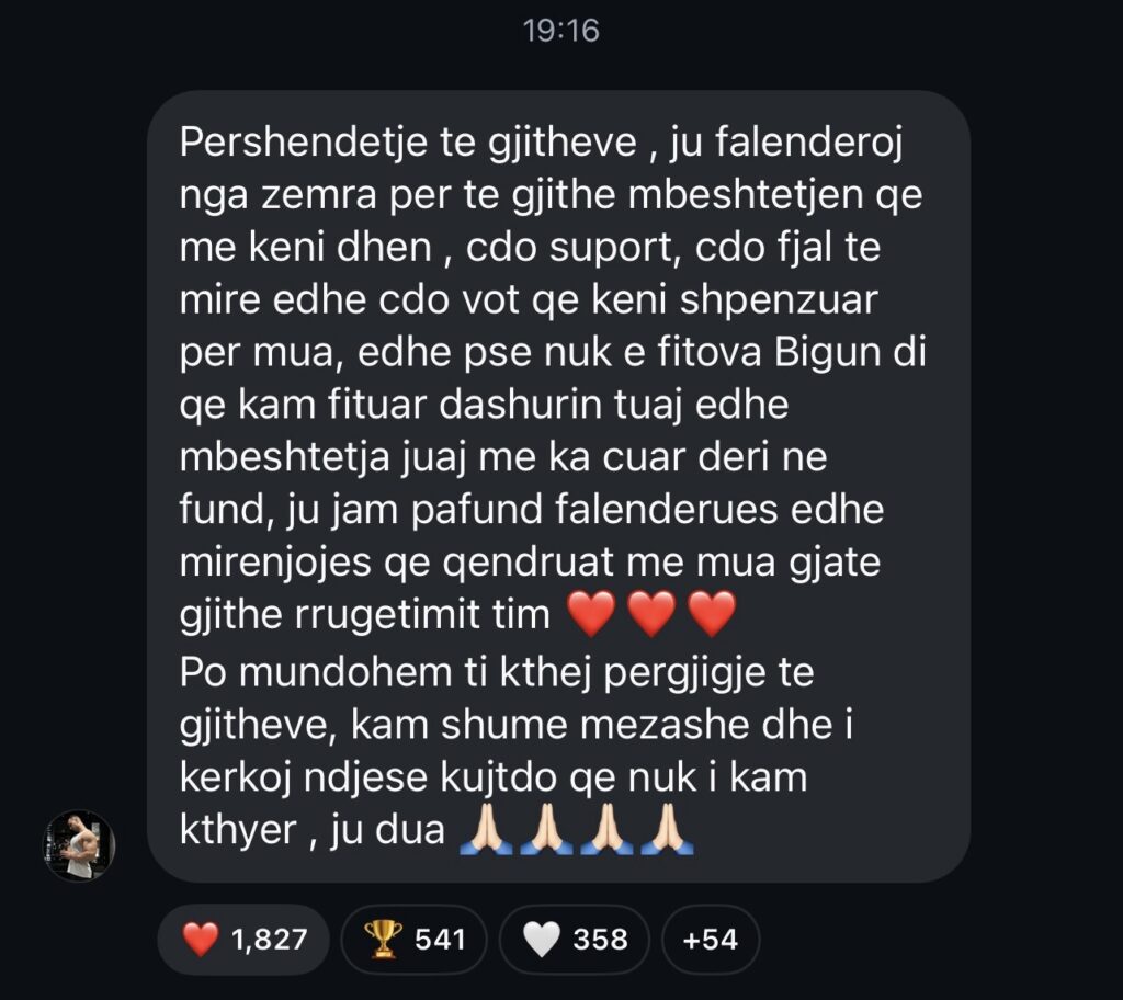 Ai shton se ka marrë një numër shumë të madh mesazhesh dhe kërkon ndjesë për ata që nuk ka arritur t’u përgjigjet, ndërsa premton se do mundohet t’i kthejë përgjigje të gjithëve.