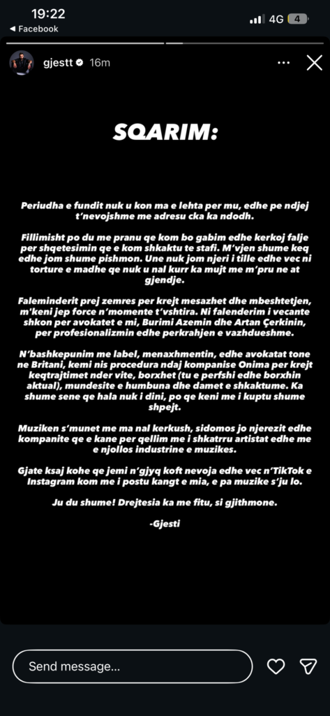 Pas lirimit nga paraburgimi, Gjesti ka reaguar për herë të parë publikisht përmes një mesazhi në rrjetet sociale, duke sqaruar situatën dhe duke ndarë emocionet e tij.