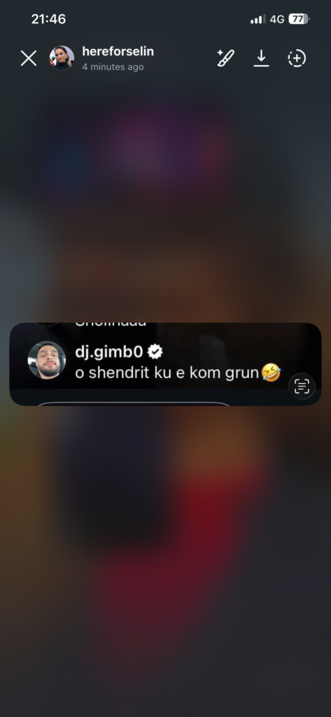 Gjatë transmetimit live, ku të dy dukeshin të afërt dhe në super humor, komentet nga publiku kanë qenë të shumta. Por ai që “vuri flakën” ishte komenti i DJ Gimbos, i cili shkroi me tone humori: “O Shendrit, ku e kom grun 😂”.