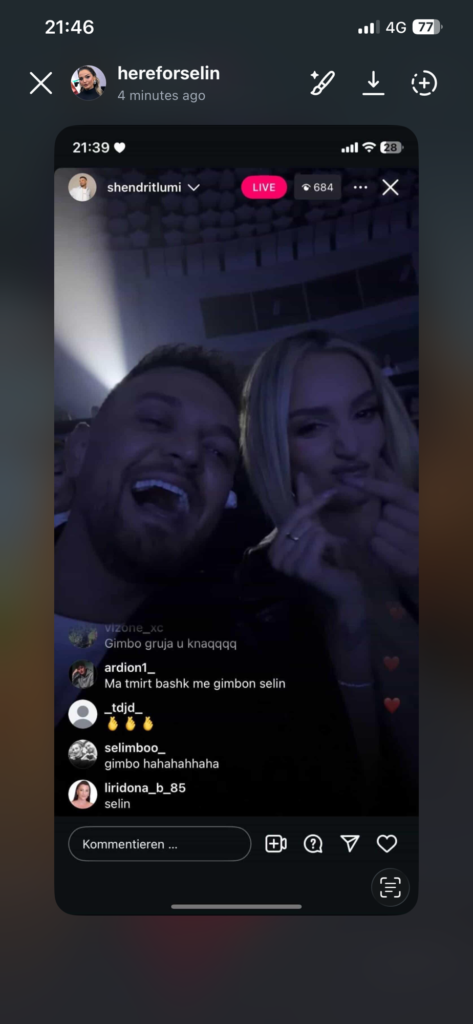 Një moment që nuk i shpëtoi aspak fansave ka ndodhur së fundmi në rrjetet sociale, teksa Shendriti dhe Selin janë shfaqur bashkë në një live në Instagram, duke tërhequr menjëherë vëmendjen e ndjekësve.