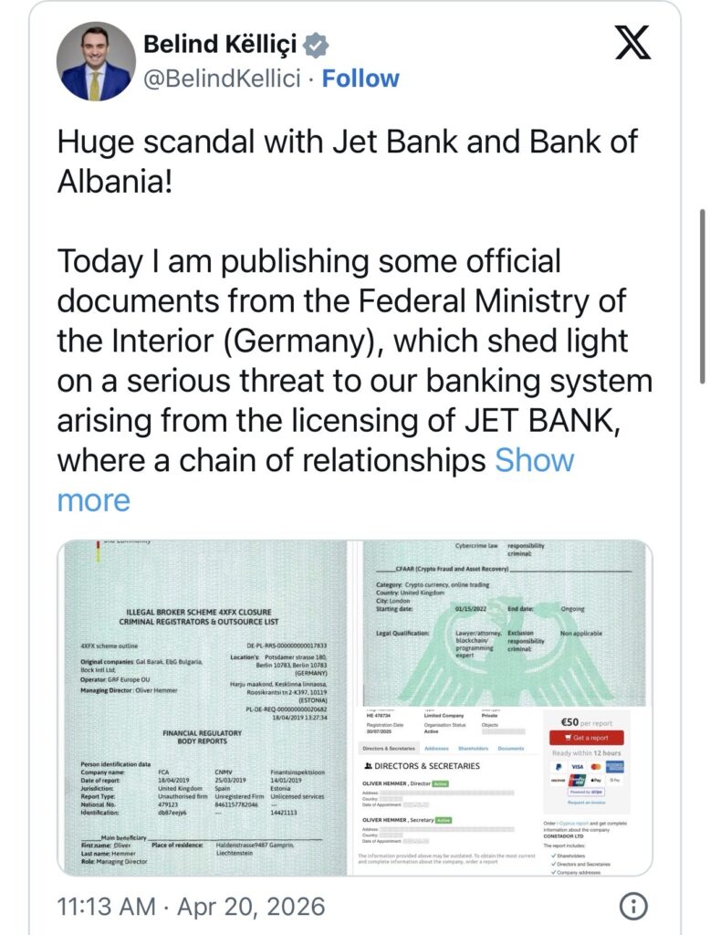 Një debat i fortë publik është ndezur në Shqipëri pas deklaratave të bëra nga përfaqësuesi i Partisë Demokratike, Belind Këlliçi, i cili ka publikuar disa dokumente që pretendon se lidhin licencimin e bankës online “Jet Bank” me individë të përfshirë në skema mashtrimi në Evropë.