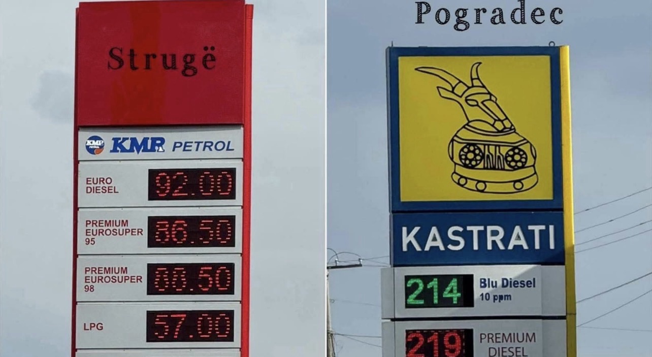 Në të majtë paraqitet çmimi aktual i naftës në Maqedonia e Veriut: 86.50 denar, ose rreth 141 lekë për litër. Në të djathtë, realiteti shqiptar: 214 lekë për litër në Shqipëria.