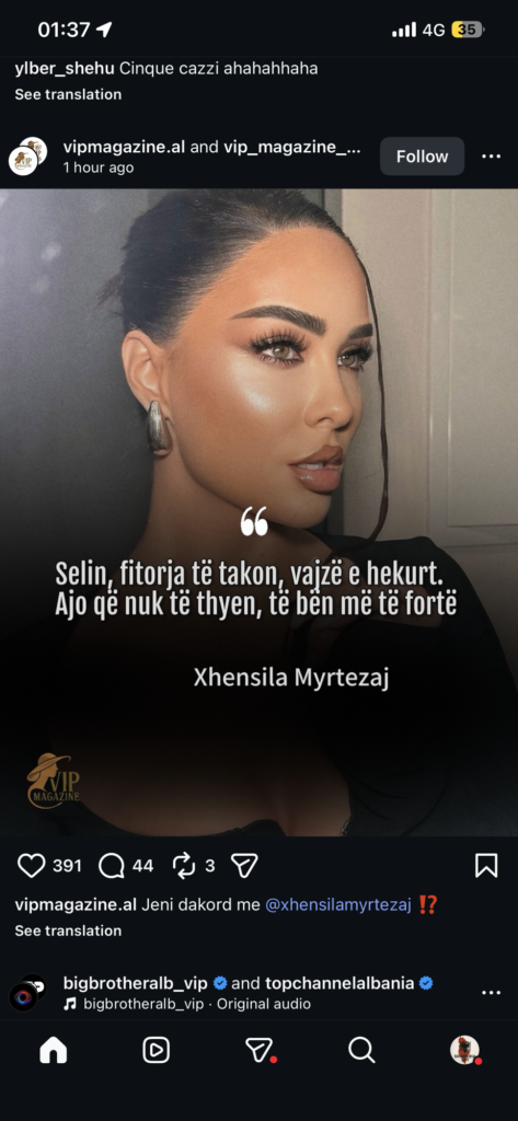 Këngëtarja e njohur Xhensila Myrtezaj ka ndezur rrjetin me një deklaratë të fortë në mbështetje të Selinit, vetëm pak orë para finales së madhe të Big Brother VIP Albania.