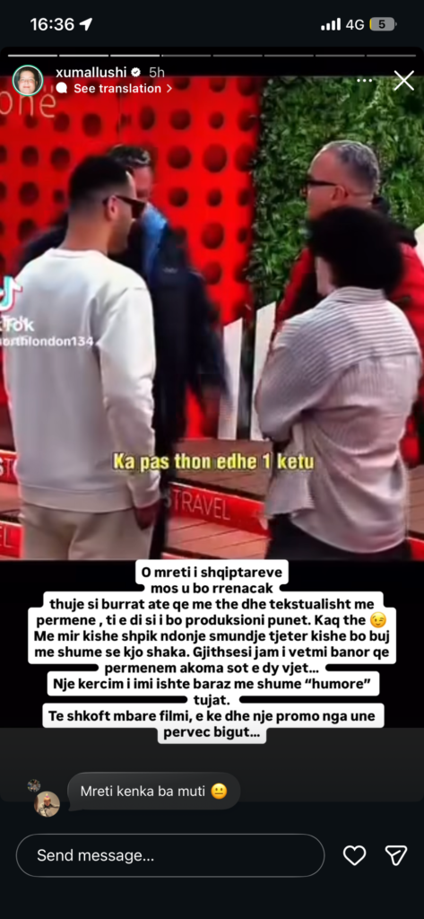🗣️ “Thuje si burrat atë që më the dhe tekstualisht më përmende. Ti e di si i bo produksioni punët… Me mirë kishe shpik ndonjë sëmundje tjetër, kishe bo bujë më shumë se kjo shaka!”